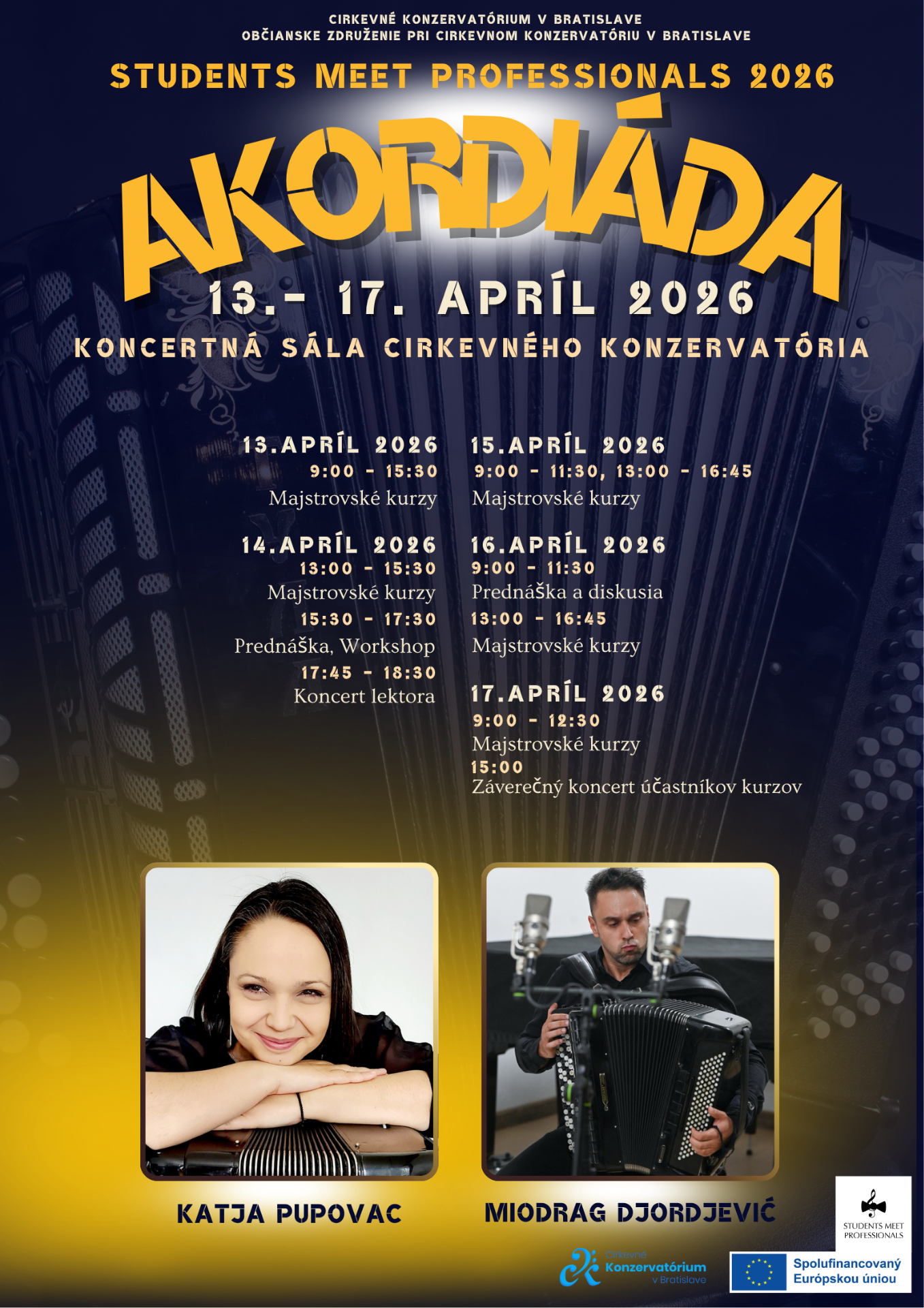 dovoľujeme si Vás informovať, že na Cirkevnom konzervatóriu organizujeme v tomto roku podujatie Akordiáda, spojené s odborným workshopom, koncertmi a majstrovskými kurzmi. Podujatie sa uskutoční v termíne 13. 4. 2026 – 17. 4. 2026 v priestoroch Koncertnej sály Cirkevného konzervatória.